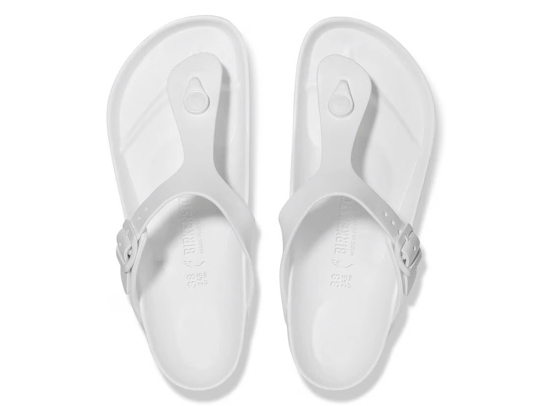 - Birkenstock Gizeh EVA 0128221 – weiße, federleichte Zehentrenner aus wasserfestem EVA.
