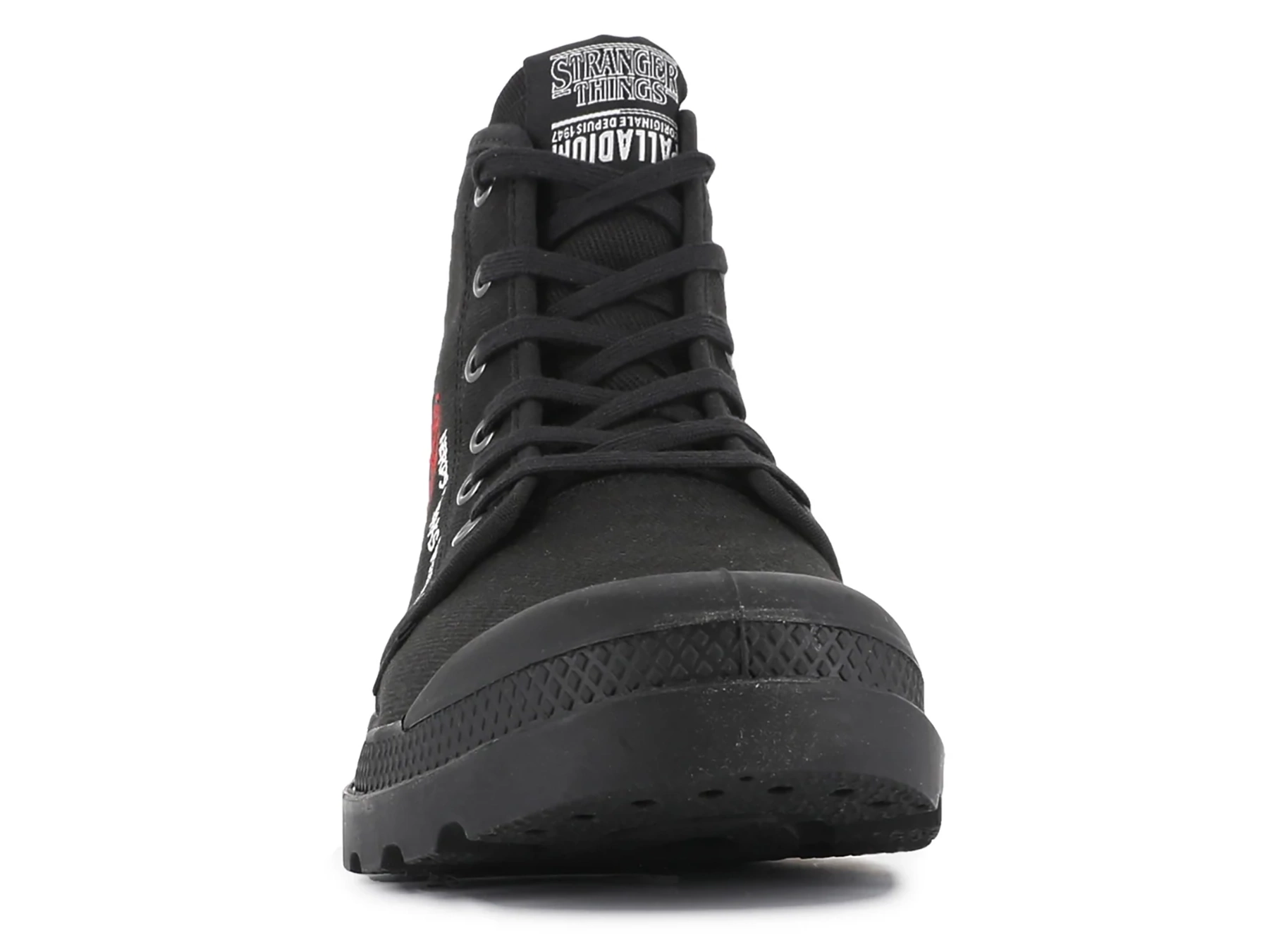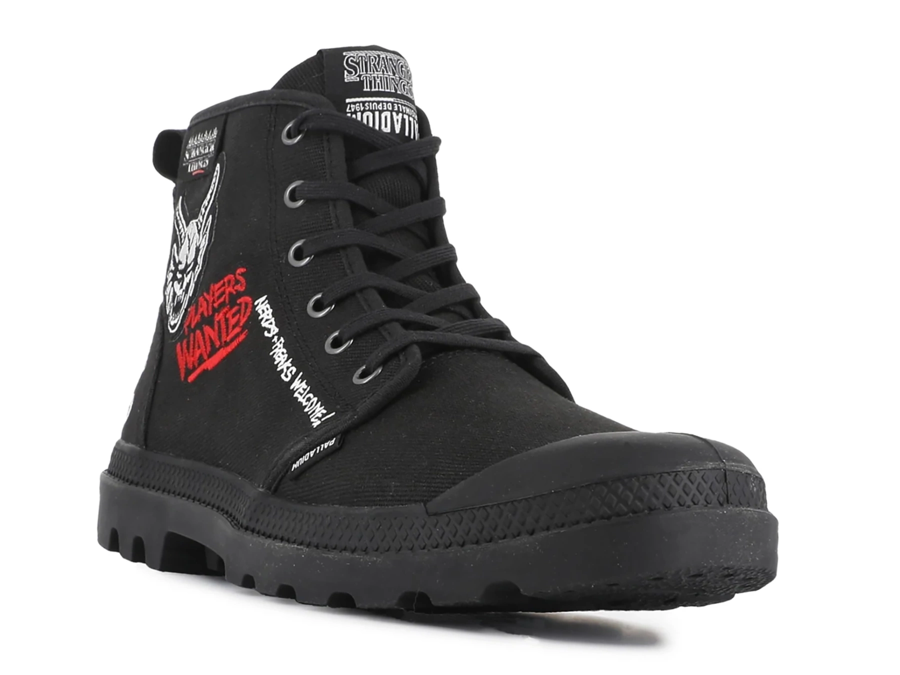 • Palladium Pampa Hellfire All Black — Spezialedition Canvas-Boot inspiriert vom Stranger Things Hellfire Club mit Stickereien und umgekehrtem Branding.
