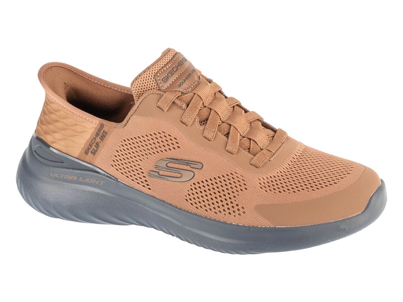 - Skechers Slip-ins Bounder 2.0 Emerged – braun-schwarze Sportschuhe mit Hands Free Slip-ins® Technologie und Air-Cooled Memory Foam® Einlegesohle.
